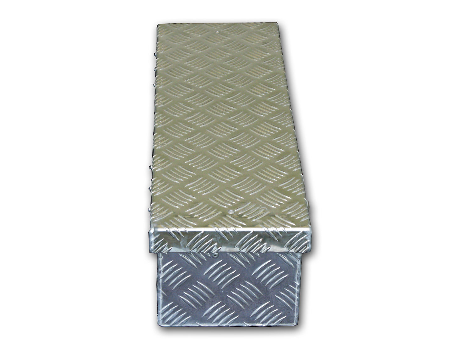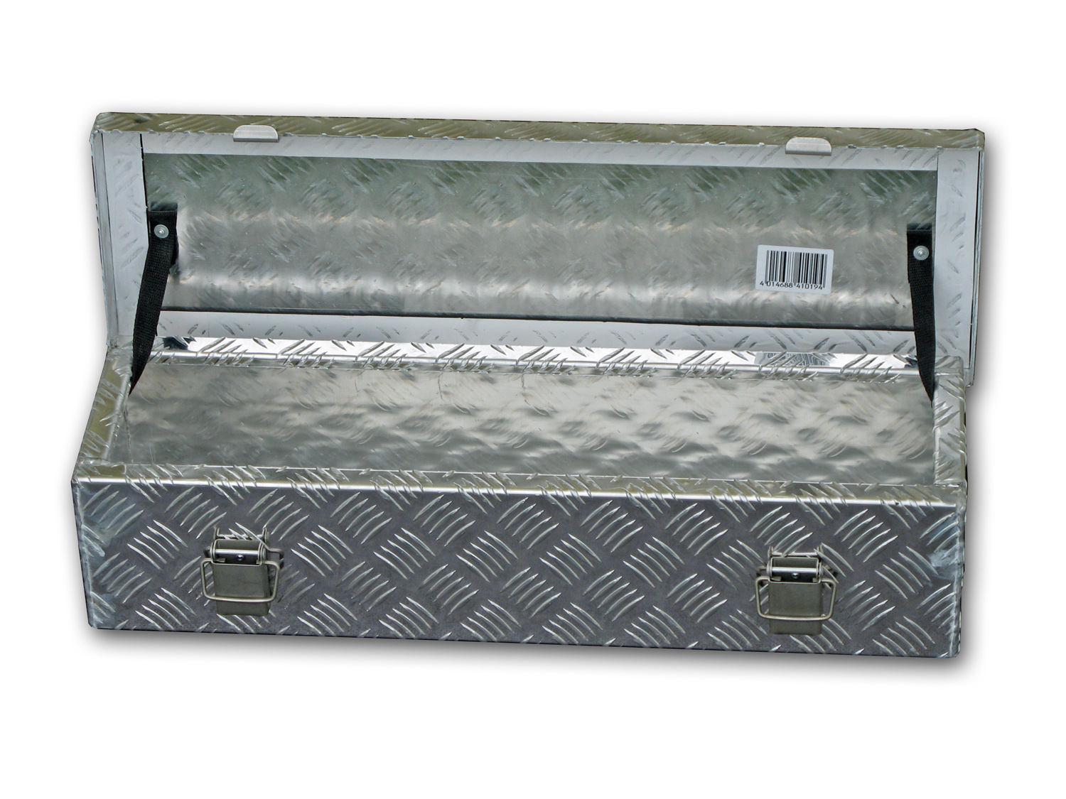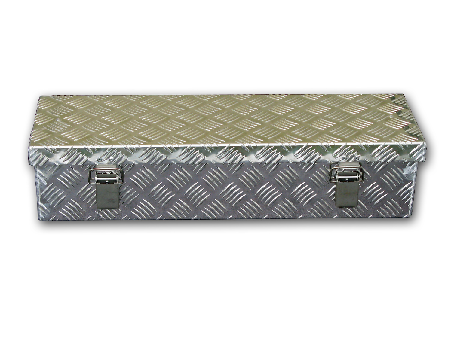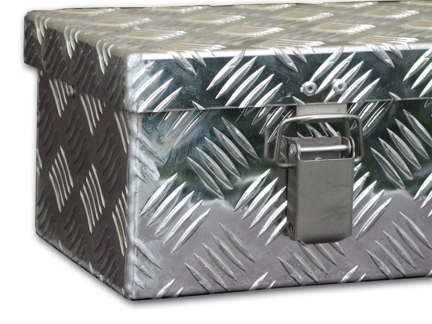 Standard Aluminium Boxen sind mit Haltebändern ausgestattet und werden mit Edelstahlschließe gefertigt, vorbereitet für das Verschließen mit handelsüblichen Bügelschlössern / Vorhängeschloss. Alle Boxen sind mit Feder-Haltegriffen versehen.