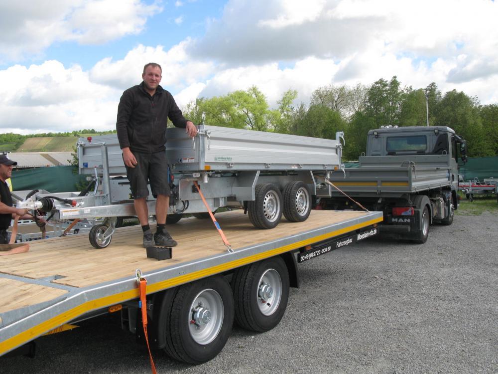 Übers Internet gefunden, telefonisch kurz die Abwicklung besprochen und per Mail gekauft. Aus der großen Auswahl an sofort lieferbaren Kippern hat sich Herr Netter den Humbaur HTK Dreiseitenkipper ausgewählt und sich kurz darauf auf den Weg nach Würzburg gemacht. Der Garten- und Landschaftsbauer Benjamin Netter aus Lobbach bei Heidelberg freut sich, dass dieser sofort lieferbar und innerhalb 24 Stunden abholbereit war.