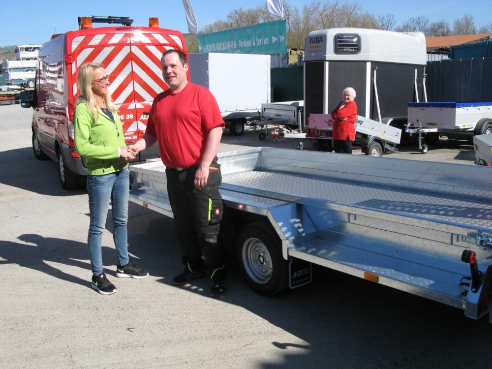 Für den Baggertransport hat sich die Firma Alexander May Dienstleistungen aus Rothenburg a.d. Fulda den großen 3.5 to Saris MAXX Baumaschinentransporter angeschafft. Unser Foto zeigt Frau Schwenkert bei Übergabe mit Herrn May.