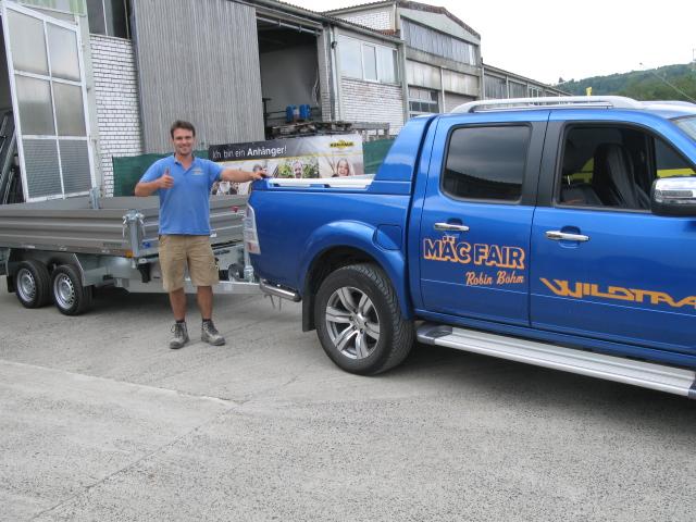 Seinen neuen Humbaur HTK Dreiseitenkipper übernimmt Herr Robin Böhm aus Lobbach für seinen Dienstleistungsbetrieb. Nun hat er zu seinem Pickup den richtigen Transportanhänger und kann auch im schwierigen Gelände die benötigten Materialien sicher transportieren.