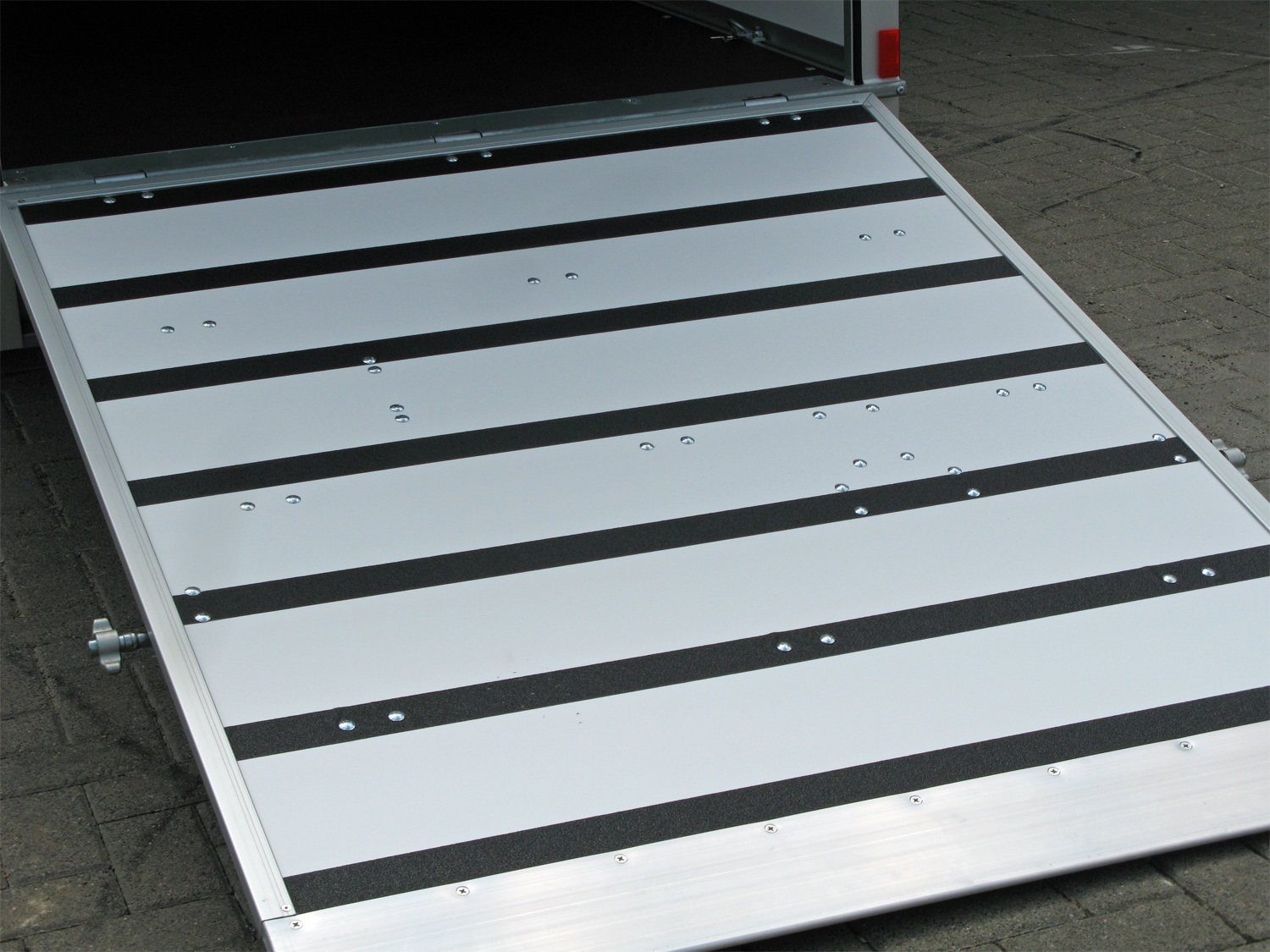 Überfahrwand weiß anstatt Türe hinten, Belastbarkeit max. 300 kg, mit Überfahrspitz und Drehstangenverschluss