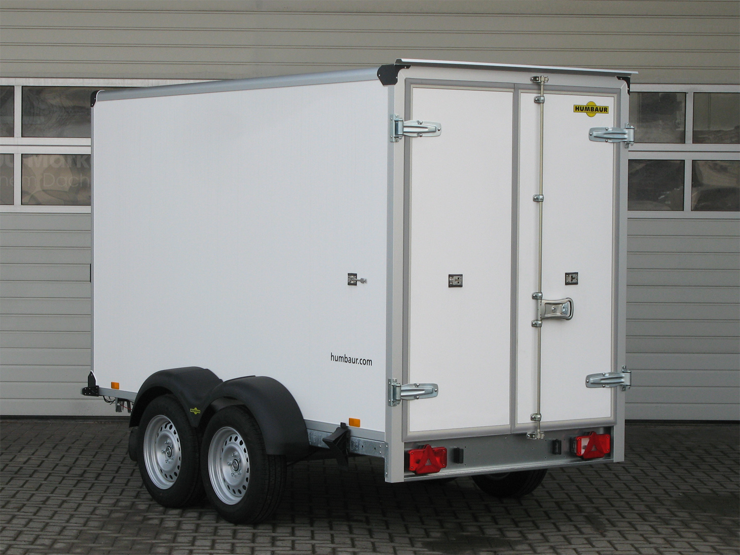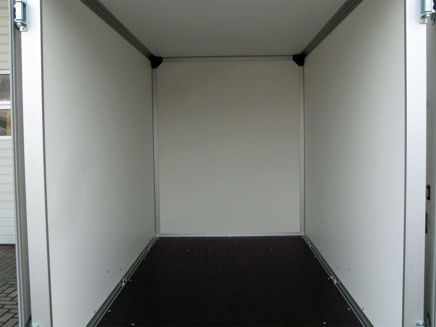 Im Innenraum ist für eine bessere Sicht eine Leuchte montiert. Alle Plywood-Koffer sind mit Scharnieren und einem abschließbaren Drehstangenverschluss aus verzinktem Stahl ausgestattet. An den Türen sind Dichtungen aus Kunststoff montiert, die ein wassergeschütztes transportieren Ihrer Ware ermöglichen. Die Aluminiumverstärkungen im Dachbereich und an der Stirnwand unten verleihen den Plywood-Koffern von Humbaur eine extreme Stabilität.