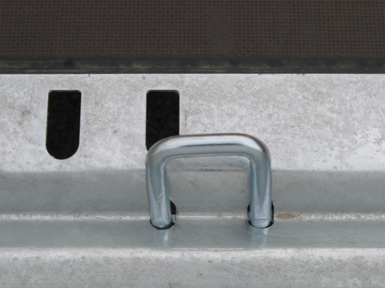 4 St. Anbinderinge versenkt in Holzboden montiert, Zugkraft je 0,2 t. Die Ringe dürfen nur über den Querträgern montiert werden