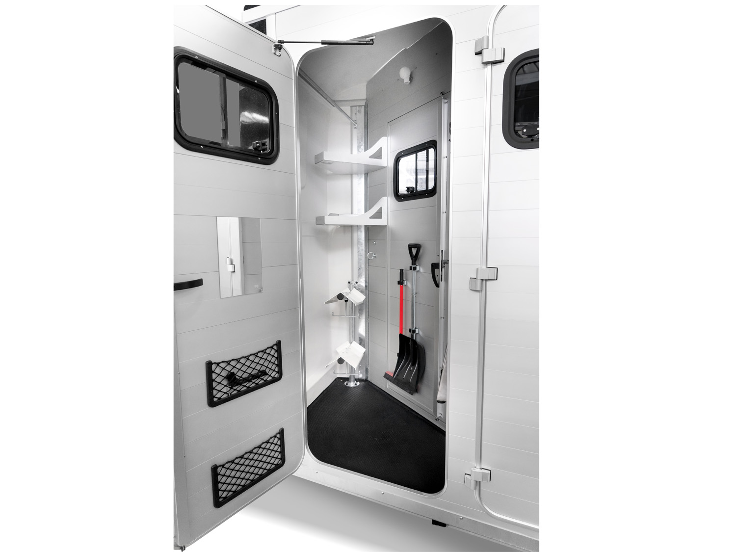 - abschließbare mannshohe Sattelkammer mit Western-Sattelhalter und Klappsitz, Stiefelknecht, Trensenhalter, Spiegel, Netz, Innenbeleuchtung, Schaufel und Besen