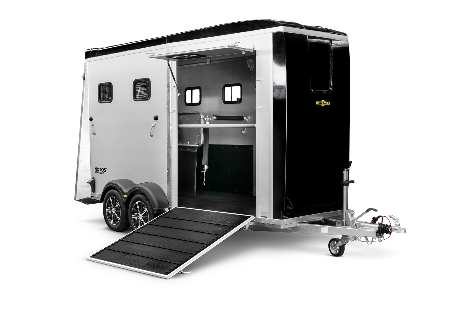 Die Auflaufklappe ist mit Trittleistengummi und Aufstiegstritt ausgestattet. Der AluBiComp-Boden und der eingeklebte und versiegelte Gummiboden sorgen für lange Haltbarkeit des Pferdeanhängers. Getönte Schiebefenster, je zwei links und rechts im Pferderaum und jeweils eines in den Einstiegstüren rechts und links, sorgen für viel Tageslicht. Das serienmäßige Windschott sichert die zugfreie Innenraumbelüftung Optional lässt sich der Notos Xtra Pro mit einer Frontausstiegsklappe ausrüsten.