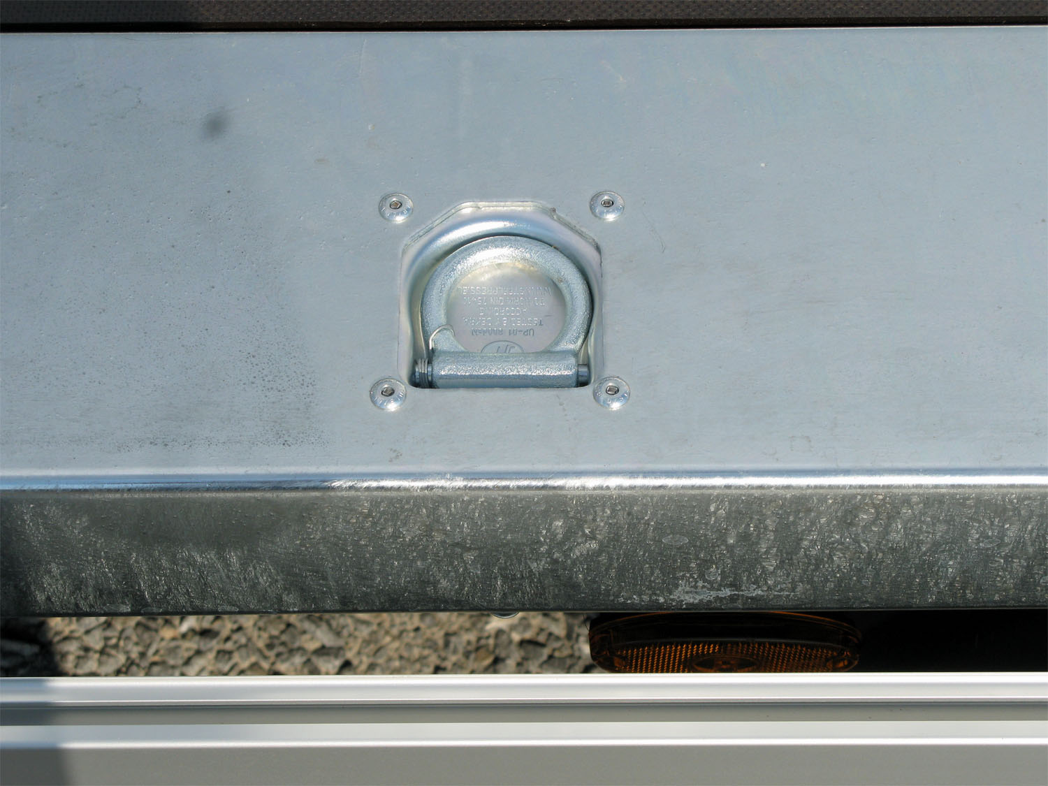 • 14 versenkte Schwerlast Verzurrösen mit je 800 daN (geprüft nach DIN 75410) auf der Ladefläche im Rahmen integriert