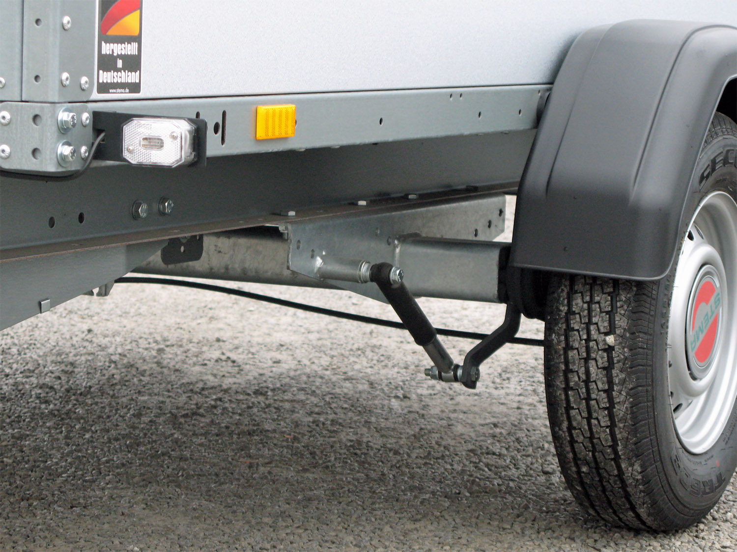 Alle gebremsten SySTEMA-Anhänger ab 850 kg zul. Gesamtgewicht sind serienmäßig mit Stoßdämpfern ausgerüstet. Diese Anhänger können direkt bei der Zulassungsstelle für 100 km/h zugelassen werden.